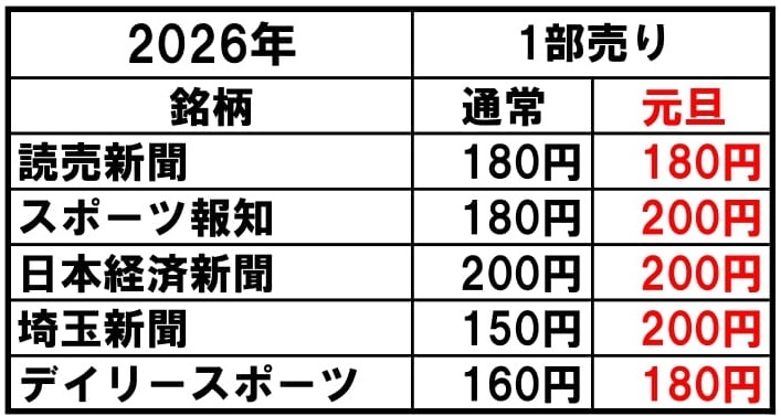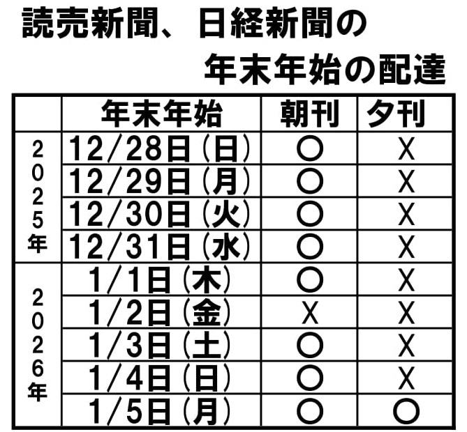 2025年12月31日 / 最終更新日時 : 2025年12月31日 yc-hanyuuseibu 新着情報(お知らせ) 2025-2026年末年始の配達と元旦の1部売り *2025年-2026年の年末年始の新聞配達 *2026年元旦の1部売り値段(取扱新聞)